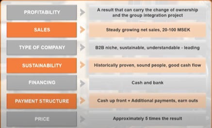 Generalmente es la directiva quién se encarga de definir, perfeccionar y ejecutar la estrategia de adquisición de la empresa. Tiene que ser una estrategia que defina qué empresas se buscan adquirir, a que precio y cual es la rentabilidad buscada (la famosa hurdle rate). En este enlace podéis ver el criterio de adquisición de Constellation Software. En la imagen inferior podéis ver el criterio de Teqnion: