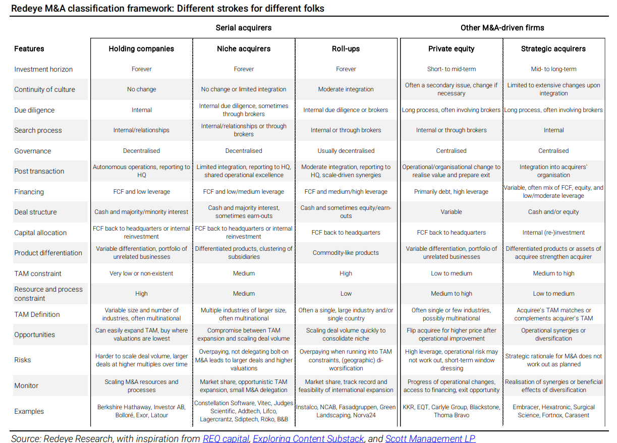 No hay una respuesta simple a esta pregunta. Depende del nicho en que la serial acquirer se desarrolle. Habrá empresas como Topicus que al adquirir softwares imprescindibles y con efectos de red, quizás no se vea tan afectada. Y otras serial acquirers industriales que una recesión les podría perjudicar más. Hay un informe muy interesante de Redeye donde estudian el desempeño de varias serial acquirers suecas durante este siglo. Os animo enormemente a leerlo.