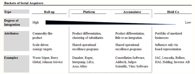 Generalmente, son empresas de nicho que son muy rentables económicamente, pero, sin posibilidades de grandes crecimiento debido a un TAM disponible limitado. El ejemplo más claro son los negocios VMS (Vertical Market Software) que ofrecen soluciones muy específicas, como softwares para la venta de tiques para el cine. Son negocios que disfrutan de ventajas competitivas y generan bastante flujo de caja libre. Gracias a esto, las serial acquirer pueden obtener ese flujo de caja libre e invertirlos en adquirir más empresas. Por lo tanto, la serial acquirer está compuesto por varios grupos operativos donde las empresas adquiridas están agrupadas y se comportan como si fuesen organizaciones independientes.